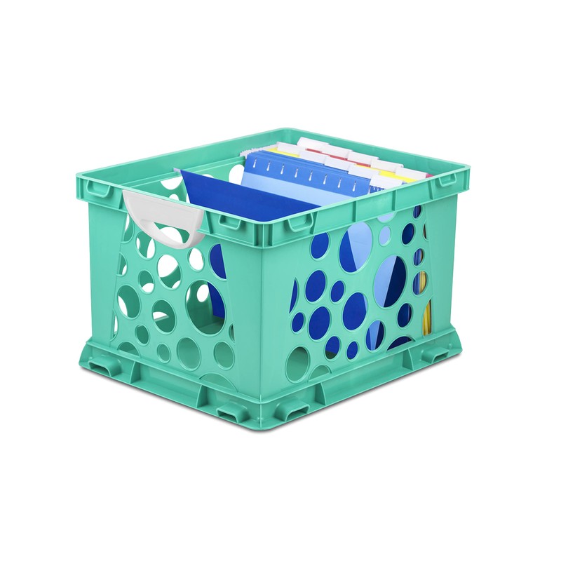 The Storex File Crate holds letter or legal paper and hanging file folders. Multiple crates can be stacked securely in any direction with the built-in interlocks for multiple, custom configurations. These crates are lightweight and convenient to transport from place to place. The all-plastic construction won't crack or warp and resists moisture.