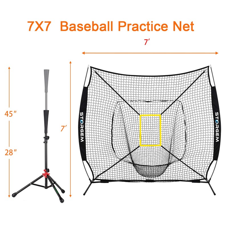 Storgem Baseball and Softball Practice Net 7×7ft Portable Hitting Pitching Batting Training Net Baseball Backstop Net with Batting Tee and Strike Zone and Bow Frame