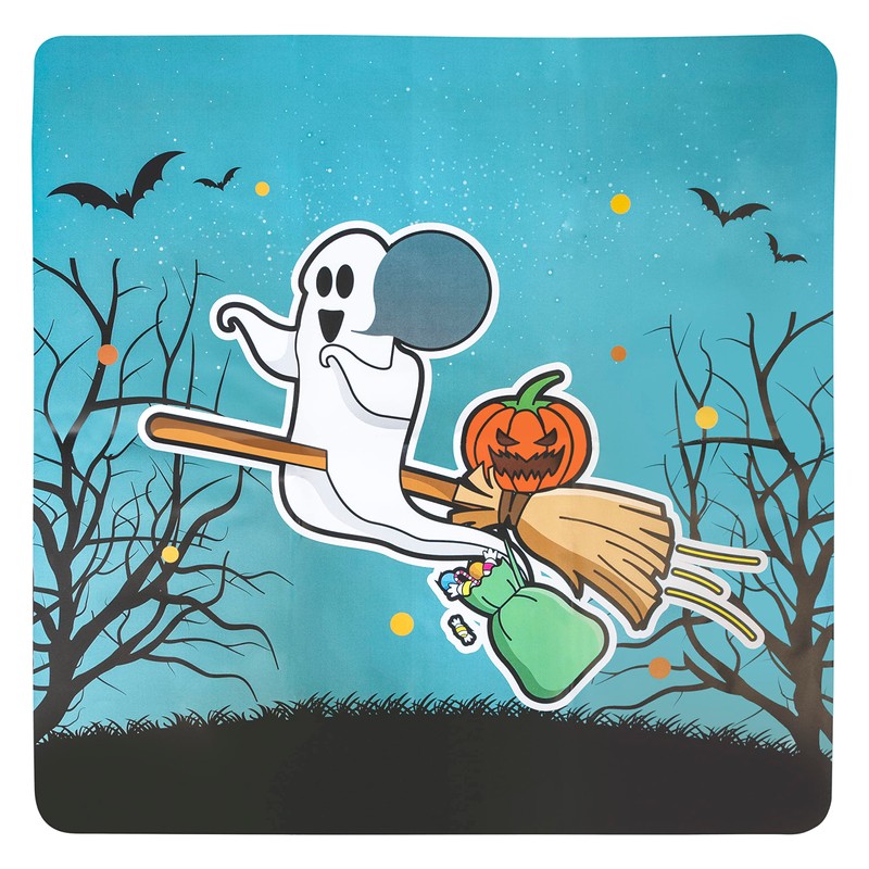 The "Help the Ghost Say "Boo!"" game includes 1x poster, 1x mask, and 12x purple speech bubble stickers with spaces to write the names of players. The game sheet measures 41cm x 41cm / 16inch x 16inch. The game sheet poster displays the image of a spooky ghost on a broomstick with a goodie bag full of sweets flying through the evening sky.