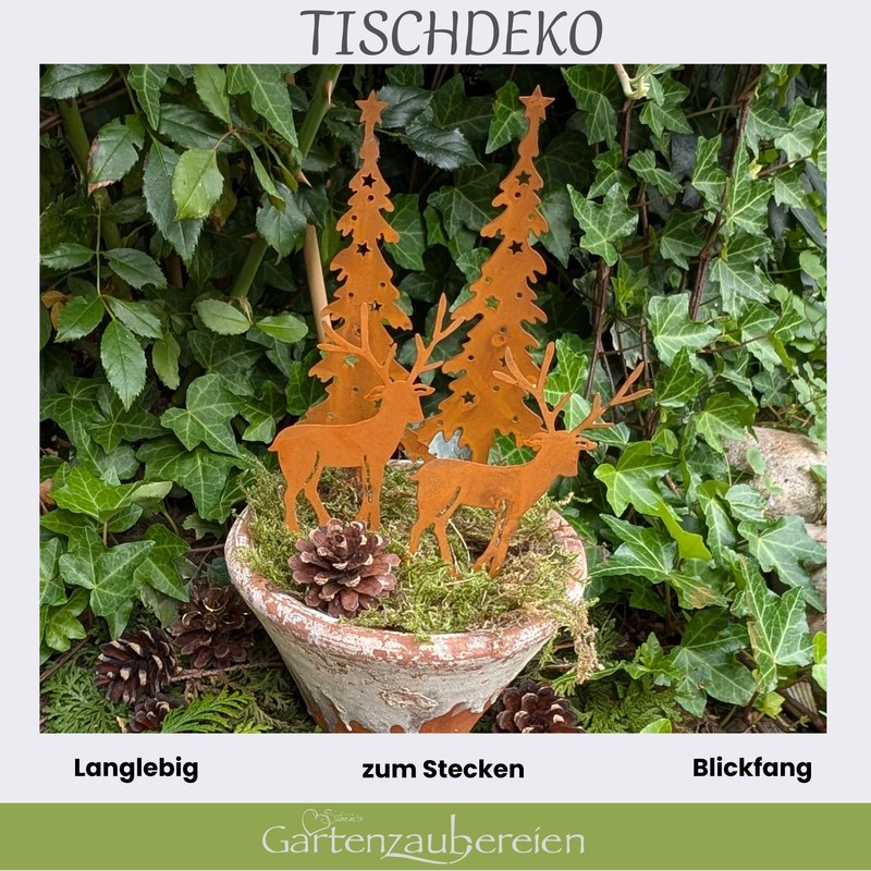 - Box contents: 2 decorative deer 12 cm plus skewer 4 cm, 2 Christmas trees 17 cm high plus 9 cm skewer. The garden decoration figures are die-cut from metal and pre-roasted. The moose have different shades of brown as colour
