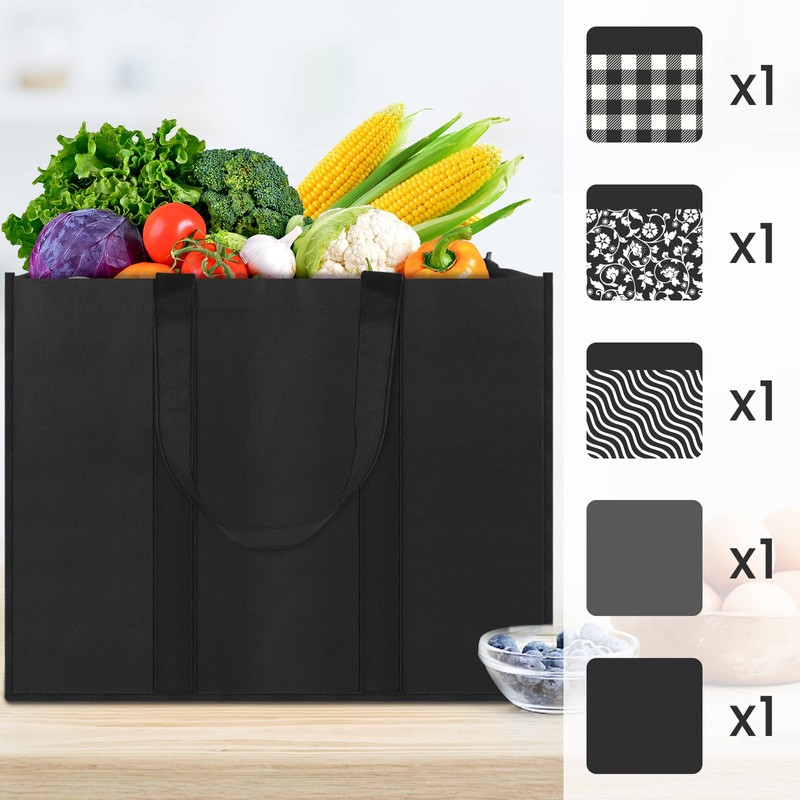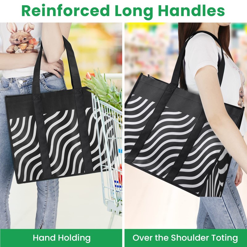 - 【LONG LASTING FABRIC & HANDLES】Made of high-quality non-woven fabric, the reusable shopping bags are strong and can accommodate odd-shaped items. The “X” stitches on the joint part make the long handles less likely to tear and allow for hand holding or carrying on the shoulder.