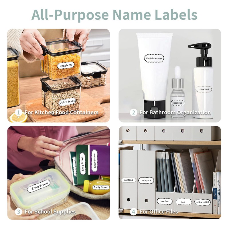 - Adhesive All-Purpose Labels - Features a variety of unique black and white name stickers,kid-friendly BPA free materials with good adhesion.These write-on labels work well on glass jars,plastic food containers, office folders and so on.Great for home, office, school and daycare center's name identification and items organization