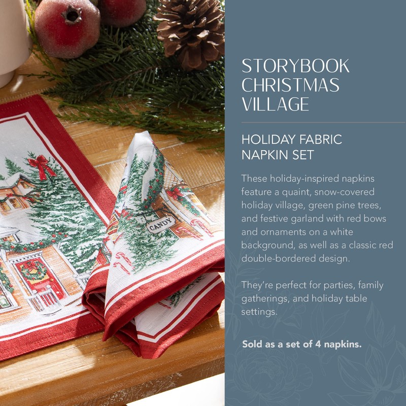 - Fashion and Function: Bring a cozy, holiday warmth to your décor; absorbent enough to use as a lap napkin. nspired by beloved Christmas stories, this napkin set is decorated with a quaint, snow-covered holiday village, green pine trees, and festive garland with red bows and ornaments. On soft white ground, it also features a classic red double bordered design.