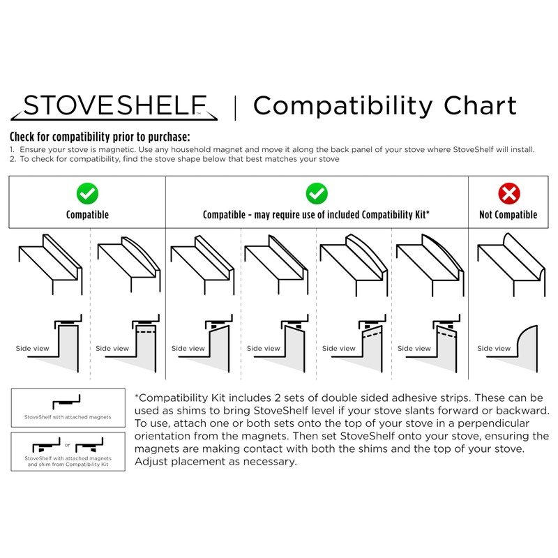 - FITS MOST FLAT AND CURVED STOVES: Measuring 30" x 3.5" x 1.5", StoveShelf is designed to fit both flat and slightly curved stoves. The magnets can also be repositioned for a custom fit! Stove Compatibility Chart available in our product carousel images. Prior to purchase, we recommend testing the back panel of your stove with any household magnet to ensure it is magnetic