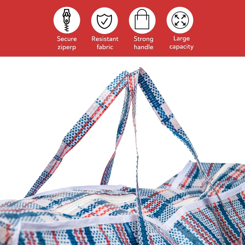 Straame’s sturdy, strong, and spacious storage bags are perfect for moving or storing and make a lightweight, economical alternative to moving boxes. Our bags provide maximum convenience without any extra packing supplies needed. You can store everything from clothes to toys and household items. Our zipped laundry bags are ideal for space-saving, room organization, storage, moving, camping, traveling, and more. The bags are reinforced with extra stitching on all carrying handles that wrap around the bag for maximum strength and security. The bags are designed for heavier loading and can safely hold up more weight. These bags are made from our premium polypropylene woven material that is easy to clean with wipes, easy to maintain, and Weather-resistant. They are an excellent alternative for moving houses or as an extra-large grocery shopping bag.Straame multipurpose storage bags are the solution to your storage problems. A classic and traditional design to easily recognize and spot your belongings. Keep your items organized while still moving in style. Whether you need to collect your laundry, a place for your seasonal clothes/bedding/blankets, or you need a large bag to put away all your Christmas decorations; these large bags are the right choice for you. Straame moving bags can be easily folded into a compact size and can be stored in a closet, car, in a drawer, or in luggage without occupying more space. Which eliminates the difficulty of assembling or disassembling boxes. They can be folded flat when not in use, taking up minimal space. The bags can be reused for your future needs with our economical design and sustainability in mind. This will be the Perfect to store bulky items, winter duvets, or seasonal decorations. Straame storage bags with zip measures 60cm x 60cm x 18cm and 80cm x 60cm x 28cm and are available in pack of 5 and 10. Colours assorted.