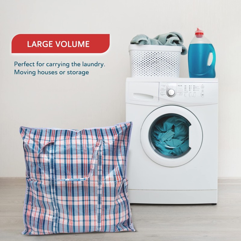 Straame’s sturdy, strong, and spacious storage bags are perfect for moving or storing and make a lightweight, economical alternative to moving boxes. Our bags provide maximum convenience without any extra packing supplies needed. You can store everything from clothes to toys and household items. Our zipped laundry bags are ideal for space-saving, room organization, storage, moving, camping, traveling, and more. The bags are reinforced with extra stitching on all carrying handles that wrap around the bag for maximum strength and security. The bags are designed for heavier loading and can safely hold up more weight. These bags are made from our premium polypropylene woven material that is easy to clean with wipes, easy to maintain, and Weather-resistant. They are an excellent alternative for moving houses or as an extra-large grocery shopping bag.Straame multipurpose storage bags are the solution to your storage problems. A classic and traditional design to easily recognize and spot your belongings. Keep your items organized while still moving in style. Whether you need to collect your laundry, a place for your seasonal clothes/bedding/blankets, or you need a large bag to put away all your Christmas decorations; these large bags are the right choice for you. Straame moving bags can be easily folded into a compact size and can be stored in a closet, car, in a drawer, or in luggage without occupying more space. Which eliminates the difficulty of assembling or disassembling boxes. They can be folded flat when not in use, taking up minimal space. The bags can be reused for your future needs with our economical design and sustainability in mind. This will be the Perfect to store bulky items, winter duvets, or seasonal decorations. Straame storage bags with zip measures 60cm x 60cm x 18cm and 80cm x 60cm x 28cm and are available in pack of 5 and 10. Colours assorted.