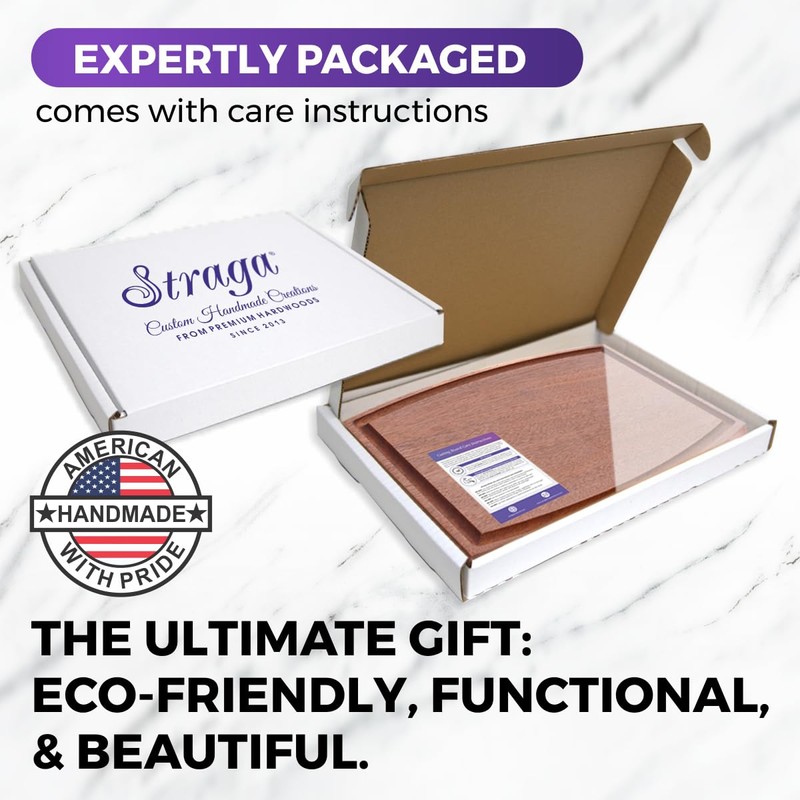 Straga Premium Mahogany Hardwood Cutting Board, 15" x 12" Arched, Sustainable Kitchen Essential, Deep Juice Groove, Dual-Function Design, Free Mineral Oil Sample and Sponge Applicator for Easy Care