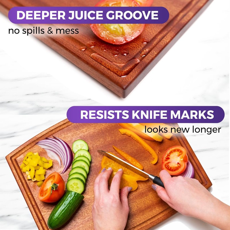 • 🌳𝐀𝐫𝐜𝐡𝐞𝐝 𝟏𝟓"𝐱 𝟏𝟐"𝐱 𝟎.𝟕𝟓” 𝐭𝐡𝐢𝐜𝐤: Perfect size chopping/cutting board for all your needs. Crafted in America from premium100% Natural Mahogany Hardwood, sustainably sourced essential for every kitchen. Made without BPA, phthalates, and formaldehyde.