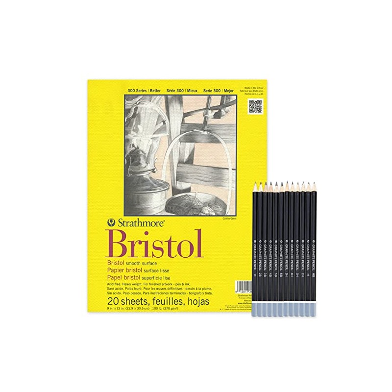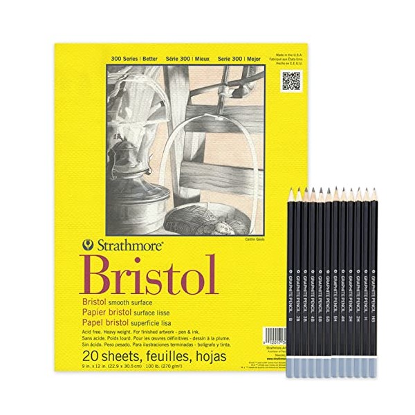 Strathmore Bristol Paper Smooth Pad, 9"x12" Tape Bound, 20 Sheets,100 lb ,Bristol Sketchbook Art Paper Smooth Finish for Drawing and Painting with 12 Graphite Pencil Set