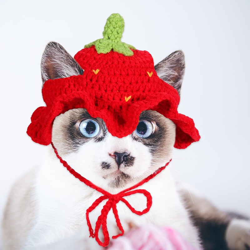 Strawberry Cat Hat, Cartoon Strawberry Design Knit Hat, Cotton & Soft Cute Knitted Hats, Funny Strawberries Dog Costume, Cute Costume Accessory for Puppy, Kitten, Small Animals, with Adjustable Cord