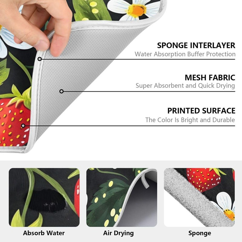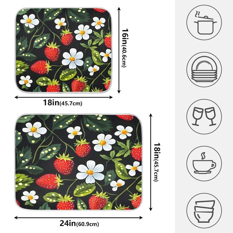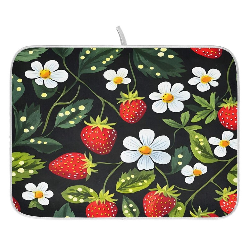 Strawberry Dish Drying Mat for Kitchen Counter White Flower Absorbent Microfiber Drying Pad Dish Mat, 16" X 18"