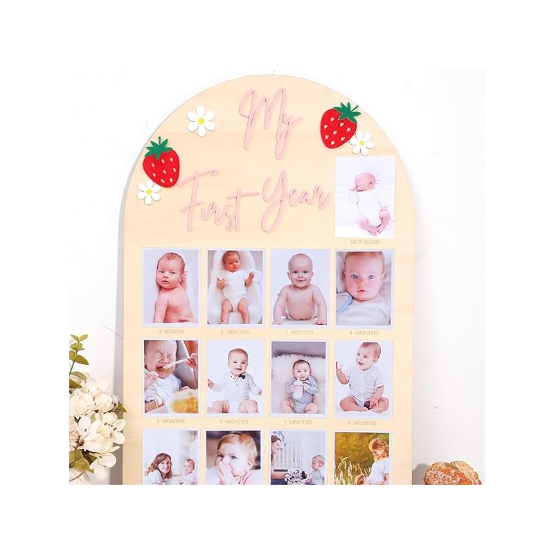 Strawberry My First Year Photo Board - One Year Old Photo Display Wood Board, sweet one Monthly Milestone Photo Board, Strawberry 1st Birthday Decoration, 12 Months Photo Display Frame (pink words)
