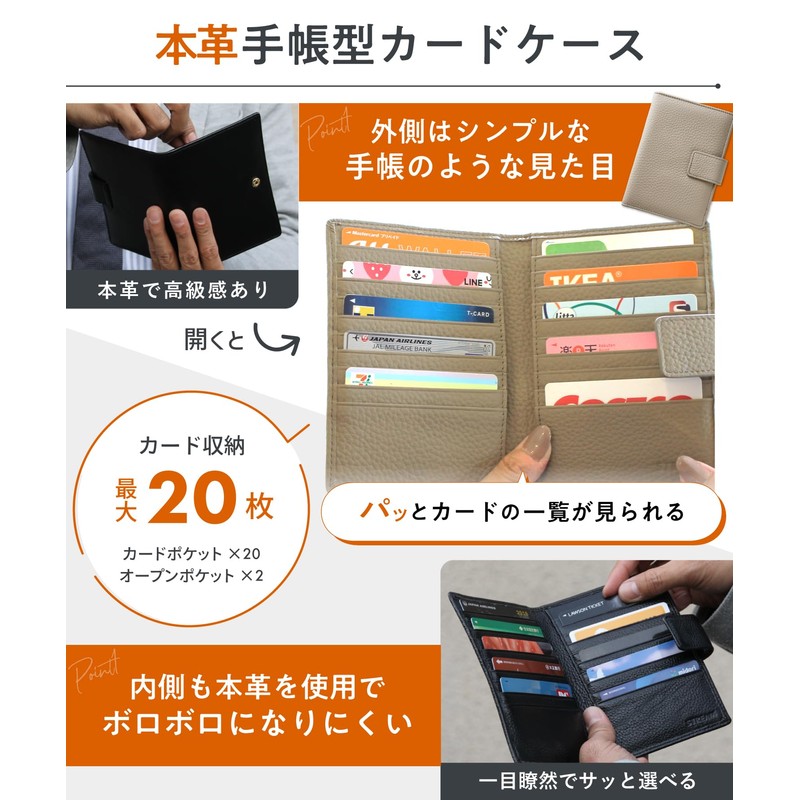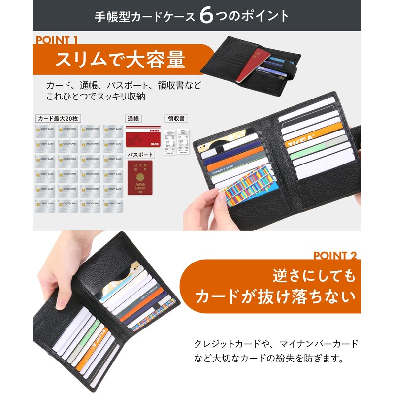 - Features: Stores large capacity cards compactly. Slim bi-fold design holds 20 cards. Thickness when stored is approximately 1.2 inches (3 cm). Keep your bag or wallet clean. There are 2 open pockets for easy storage of a passbook or passport. You can also use it for travel
