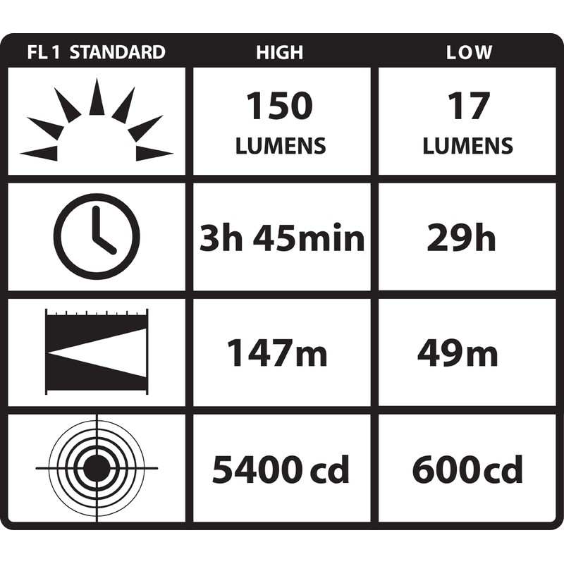 - 170 Lumens, 167m beam, 7000 Candela, 3 hour 45 min runtime