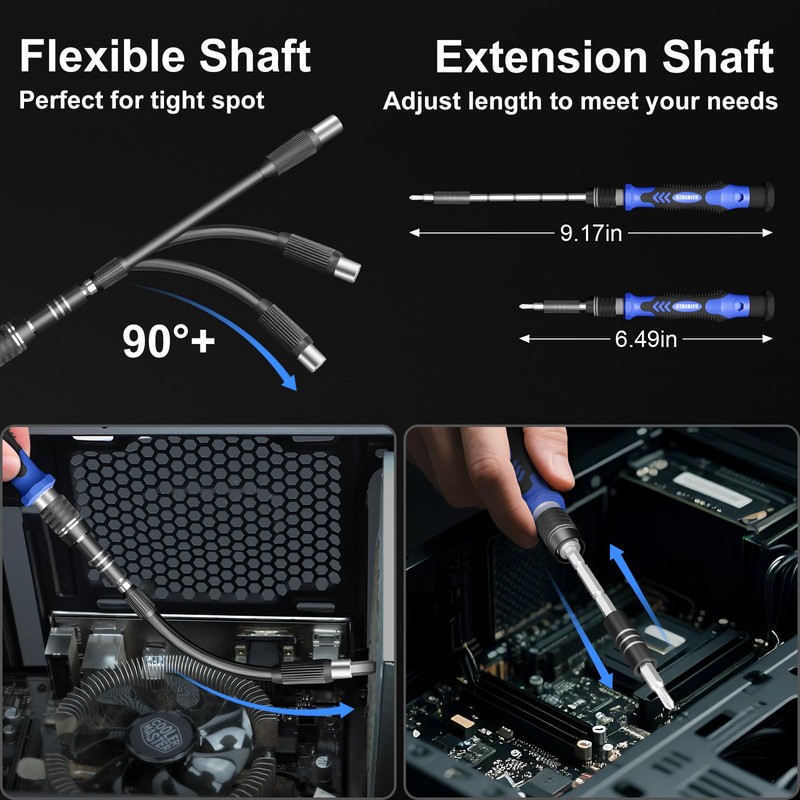 - Compact, Organized for Portability: Designed for convenience, this mini screwdriver set keeps every tool in its place. All screwdriver bits are sorted in a labeled holder, while other repair tools are securely stored in an Oxford cloth bag. Whether you're traveling, working off-site, or just want a tidy workspace, this compact design makes it easy to take your electric screwdriver set anywhere