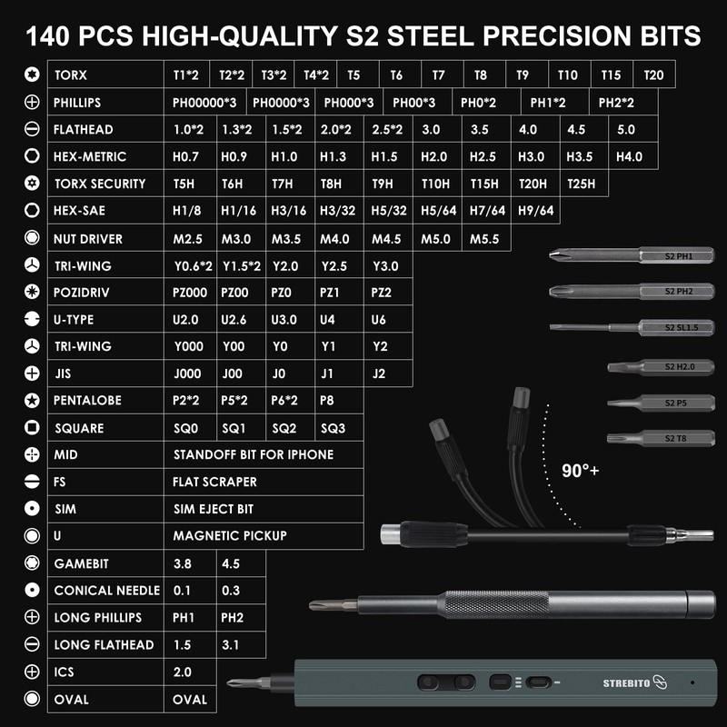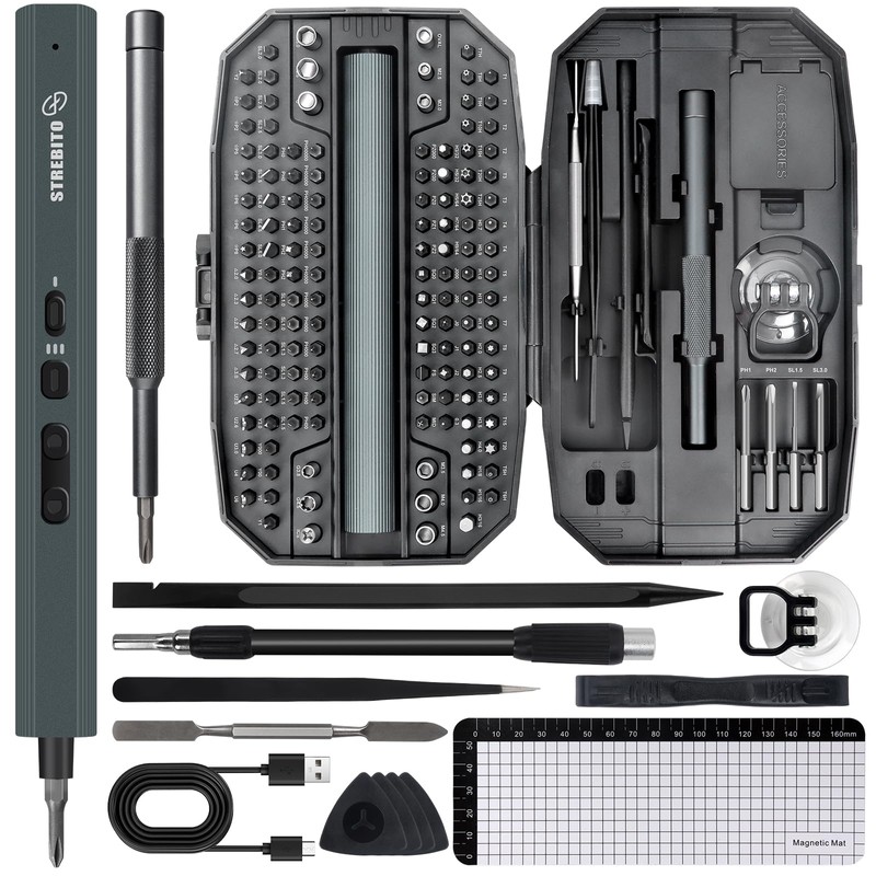 - Complete Electric Screwdriver Kit: The STREBITO -piece small electric screwdriver set includes an electric screw driver, a manual screwdriver, long bits, common bits, and additional repair tools. This comprehensive precision screwdriver set electric is ideal for repairing computer, laptop, cell phone, PC, RC car, drone, switch, PS PS console and controller, watches, and other IT tech devices