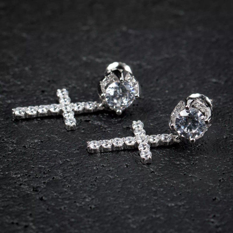 Street Knitted Round Cz Iced Sterling Silver Stud Cross Dangle Drop Hoop Earrings For Men