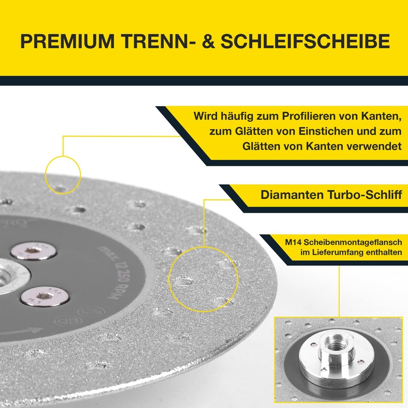 - Compatible: Our diamond disc 125 mm can be used with all standard angle grinders with M14 thread. Maximum speed 12250 rpm. Grid 80 Perfect tile grinding disc