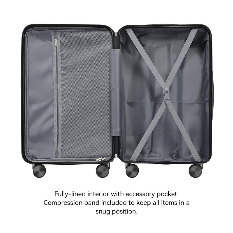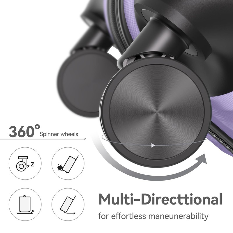 - Design: Spinner wheels, multidirectional smooth and silent 360°wheels,a full zippered compartment, a mesh compartment, and a bottom zone with a stretchy X strap. Interior mesh zip pocket and elasticated,squared full-capacity sturdy ergonomic aluminum telescoping handle design.