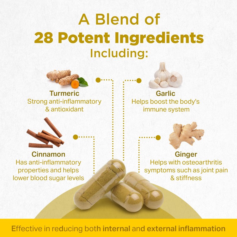 - Alleviate Aches and Swelling - Experience natural relief from bone and muscle discomforts. These capsules for joint care contain 28 ingredients that support recovery from pain and swelling from the inside out.