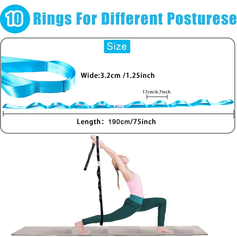 • ✅Light and Easy to Use: The Yoga Straps for Stretching has 10 loops of rope with a comfy texture. About 75 inches long and 1.25 inches wide enough to recommend most beginners to use it, yoga stretches are so easy to work with even if you've never done them. It is very suitable for people in the family, including the elderly, to do stretching exercises.