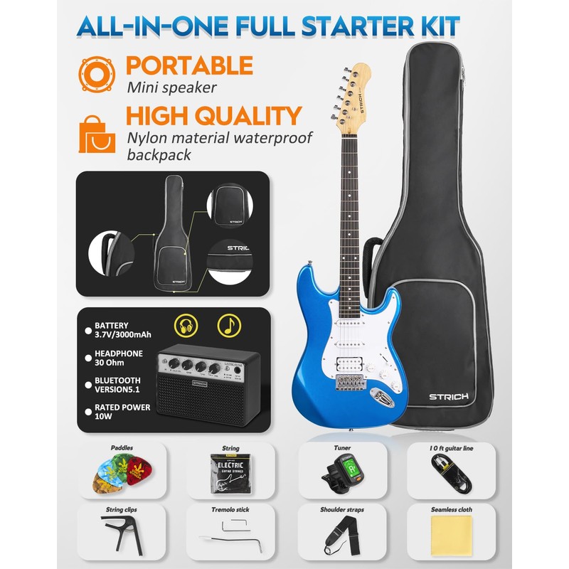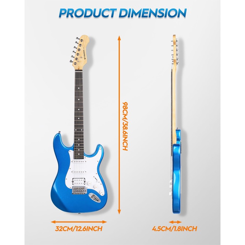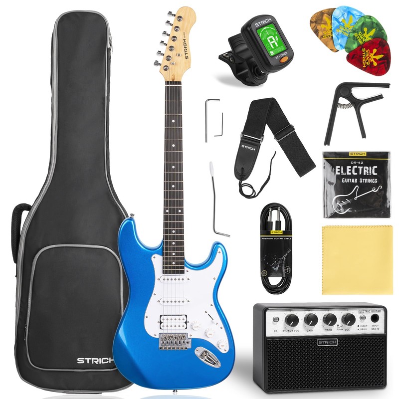 STRICH Electric Guitar Beginner Kit, Solid Body 39" Full Size Electric Guitar HSS Pick Up for Starter, with 10W Amp, Bag, Digital Tuner, Capo, Strap, String,Cable, Picks, SST-S20 Sapphire Blue