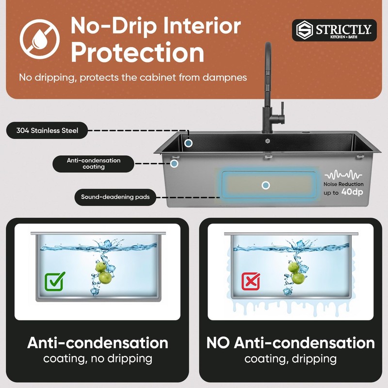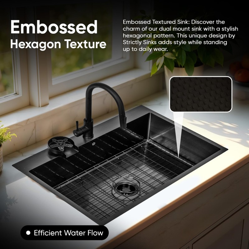 - Embossed Textured Kitchen Sink: Discover the charm of our embossed topmount kitchen sinks with a stylish hexagonal pattern. Strictly Sinks brings you a revolutionary collection that not only looks great but also tackles everyday wear and tear. This textured bottom minimizes contact points and protects the sink from scratches.