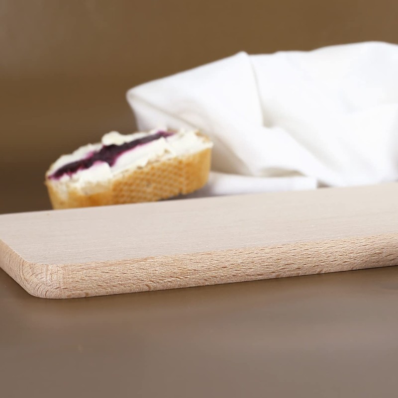 - The breakfast board for children is made of unglued beech and measures approx. 22 cm x 12 cm x 1.2 cm (L x W x H). The weight is 200 g.