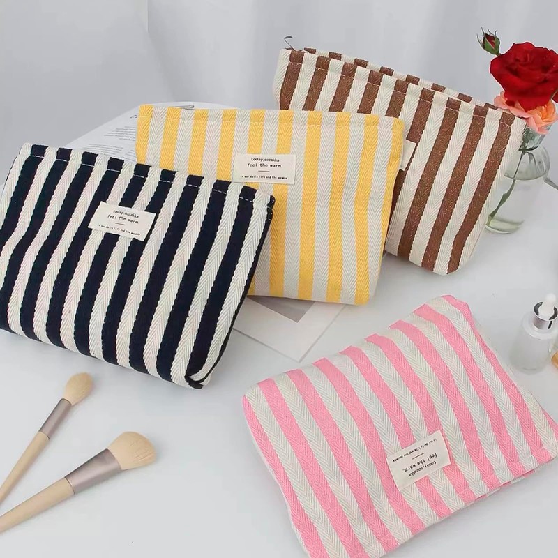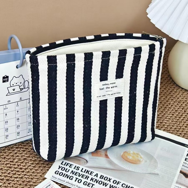 Striped Canvas Makeup Bag with Zipper,Small Travel Washable Organizer Bag with Canvas Lining for Women Girls(02Black)