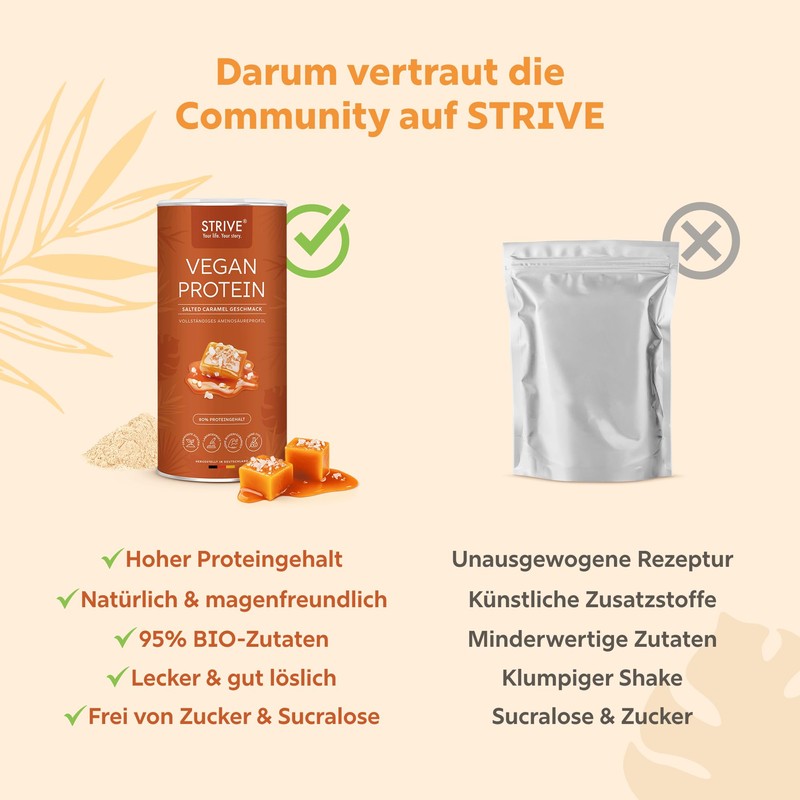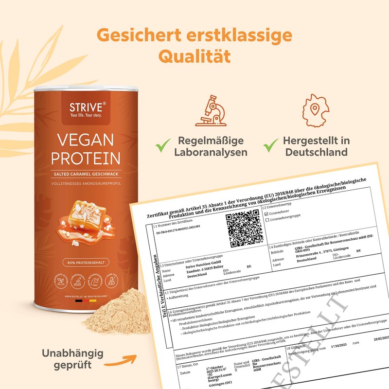 STRIVE Vegan Protein Salted Caramel, 24 g Protein per Serving, Laboratory-Tested Quality, 95% Organic Ingredients, High Bioavailability, Complete Amino Acid Profile from Five Premium Protein Sources