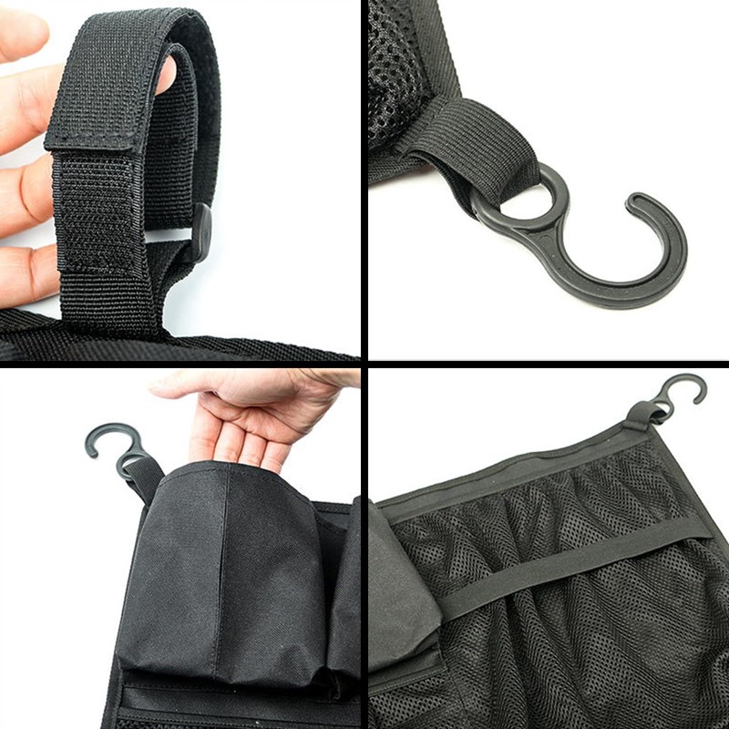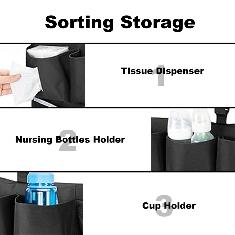 - 【 Sorting Storage 】This cargo net includes three distinct pockets: the upper left side pockets are ideal for tissues, water bottles, and nursing bottles; the lower mesh pocket is designed for diapers and other essentials; the right large mesh pocket is perfect for toys and includes webbing for hanging towels. The multiple pockets facilitate effective wet and dry partitioning, keeping your items organized and easily accessible.