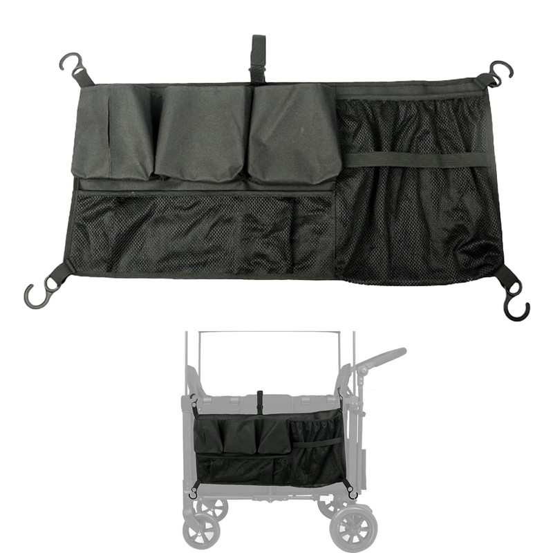 - 【 Easy to Install 】Featuring hooks with elastic band connections at all four corners, this stroller wagon organizer can be easily mounted and removed from the wagon frame. The central magic webbing helps to suspend the organizer, preventing sagging and ensuring a secure fit.