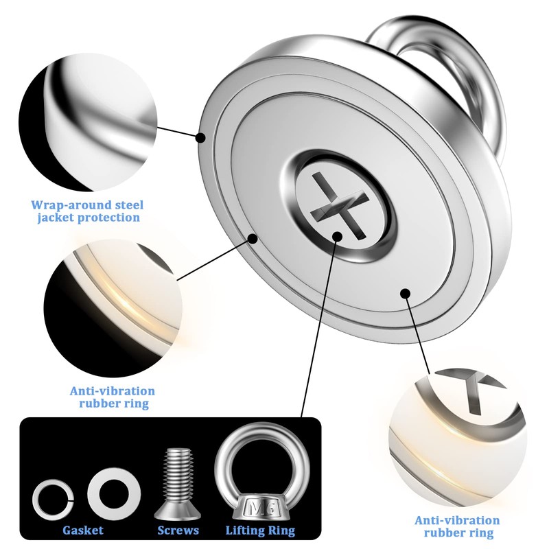 - 【Lifting magnets】Fishing magnets with Ni+Cu+Ni triple coating plating process with glossy and rust-proof coating, there are steel cups outside the magnet to provide protection for the magnet and help prevent chipping or cracking