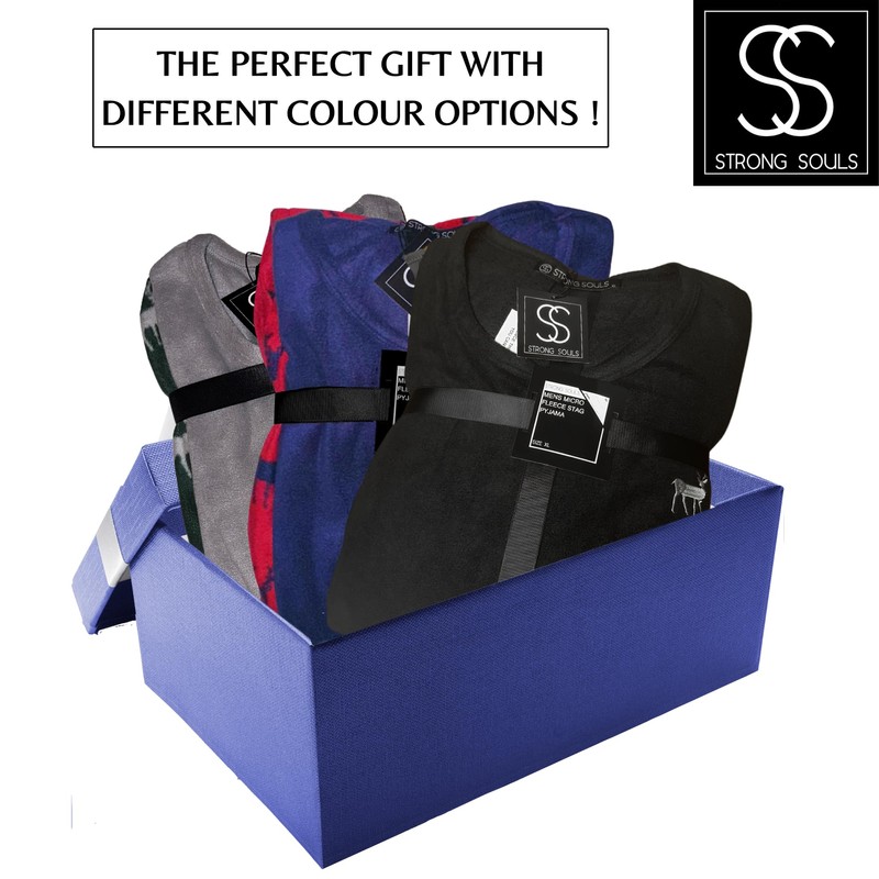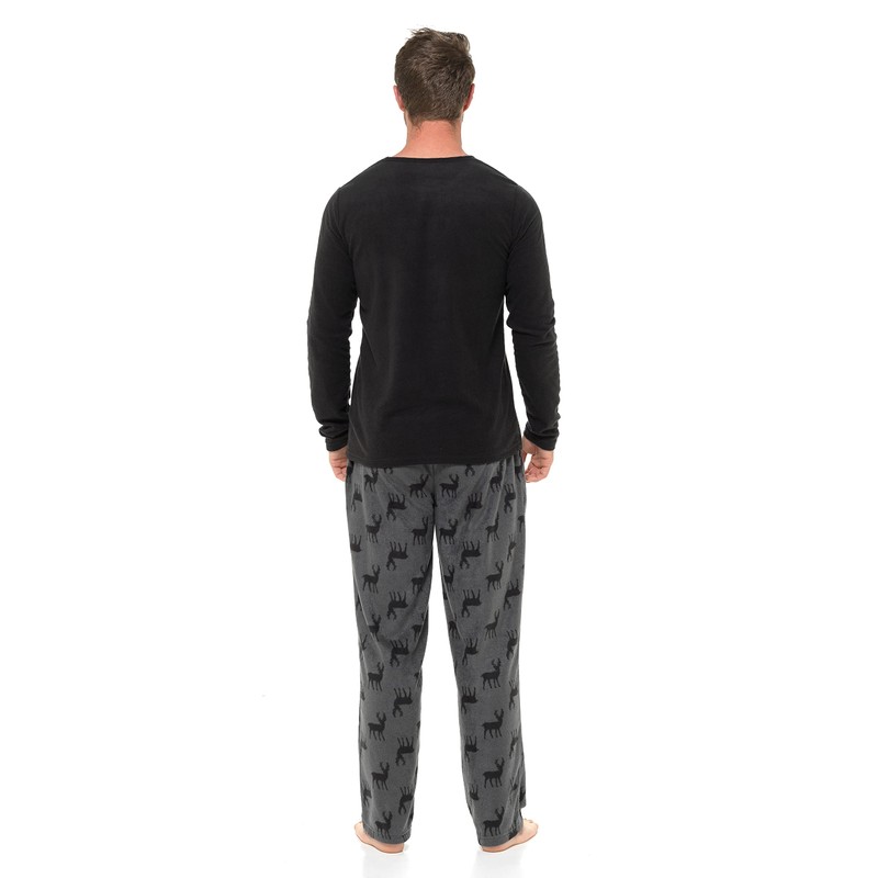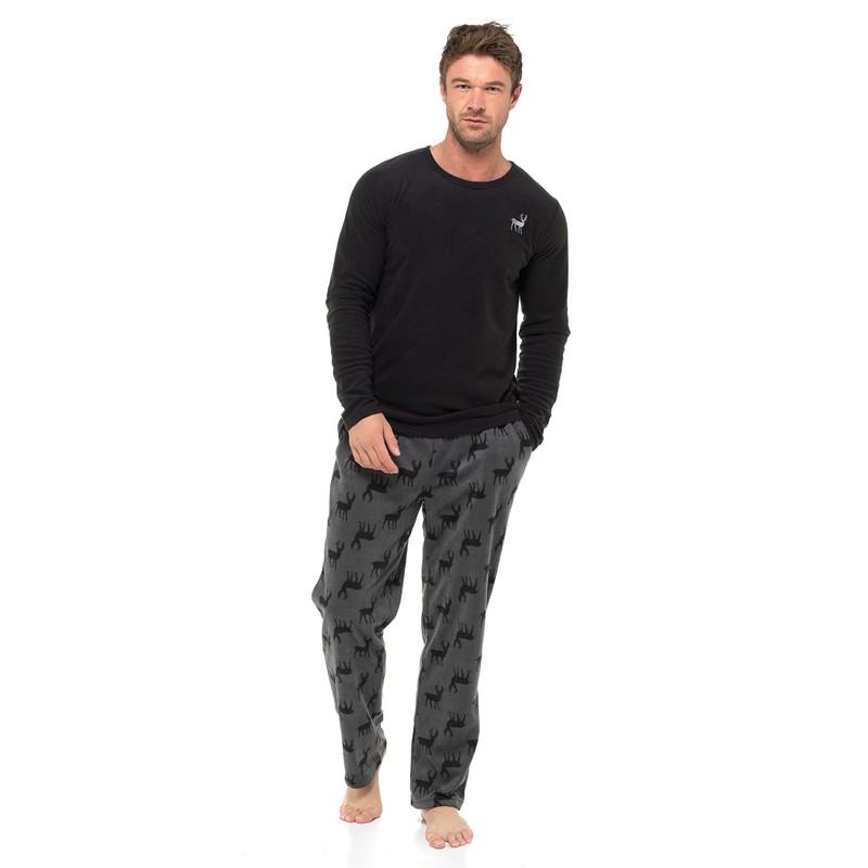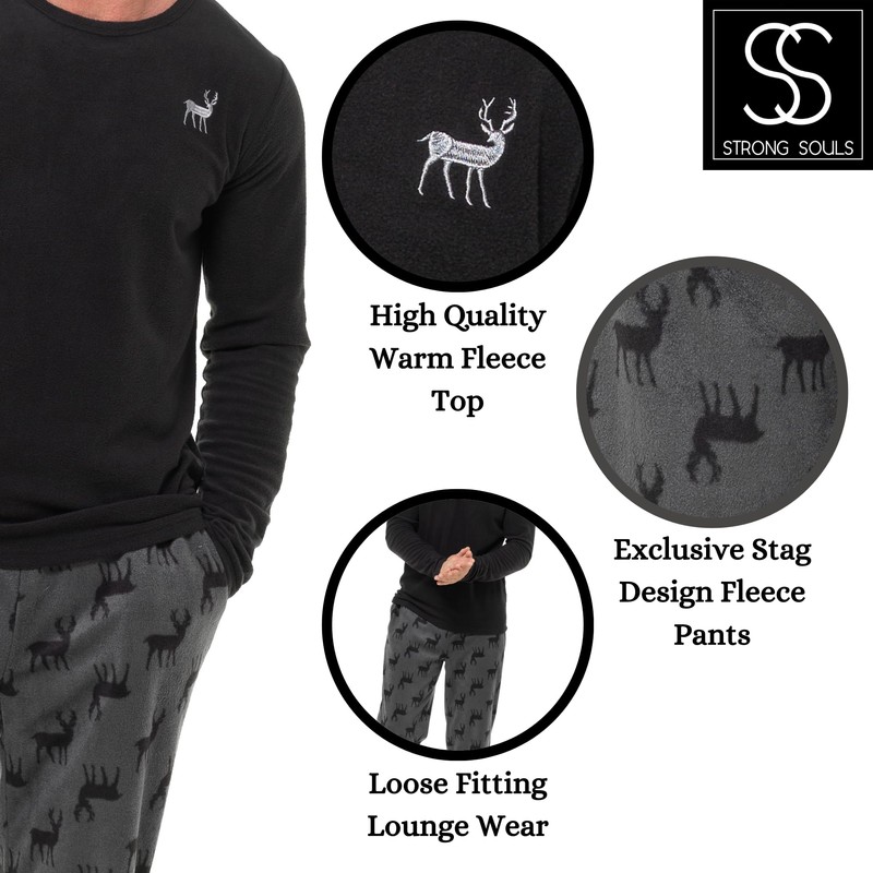 - PYJAMAS FOR MEN: The perfect warm soft set of mens pjs. These super soft pyjamas are in a classic stag design and stylish and comfortable. The top and bottoms are in a warm fleece - suitable as sleepwear at night or as lounge wear to be worn during the day for relaxing at home. The perfect gift for the man in your life.