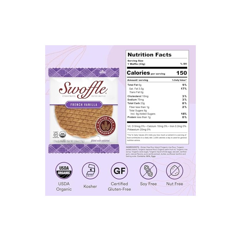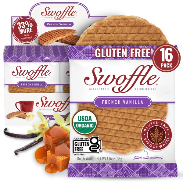 • INSPIRED BY THE TRADITIONAL DUTCH TREAT BUT WITHOUT THE ARTIFICIAL INGREDIENTS OR GLUTEN – A healthier version of the Stroopwafel, our French Vanilla Flavored Swoffle consists of a creamy caramel center between 2 thin waffle cookie layers. Taste the subtle yet delectable notes of cinnamon and nutmeg in each bite!