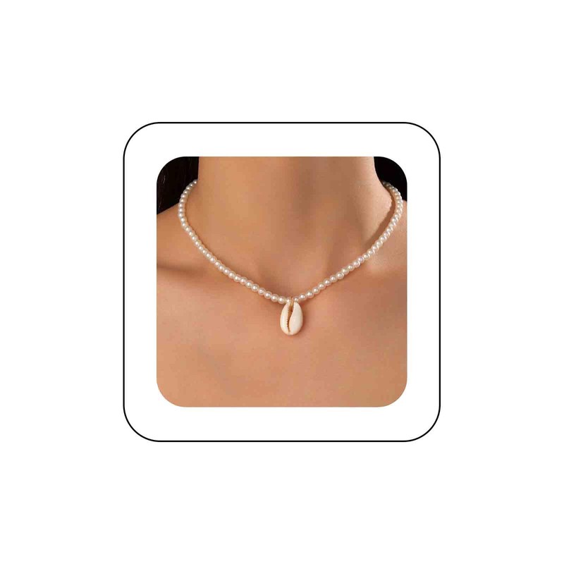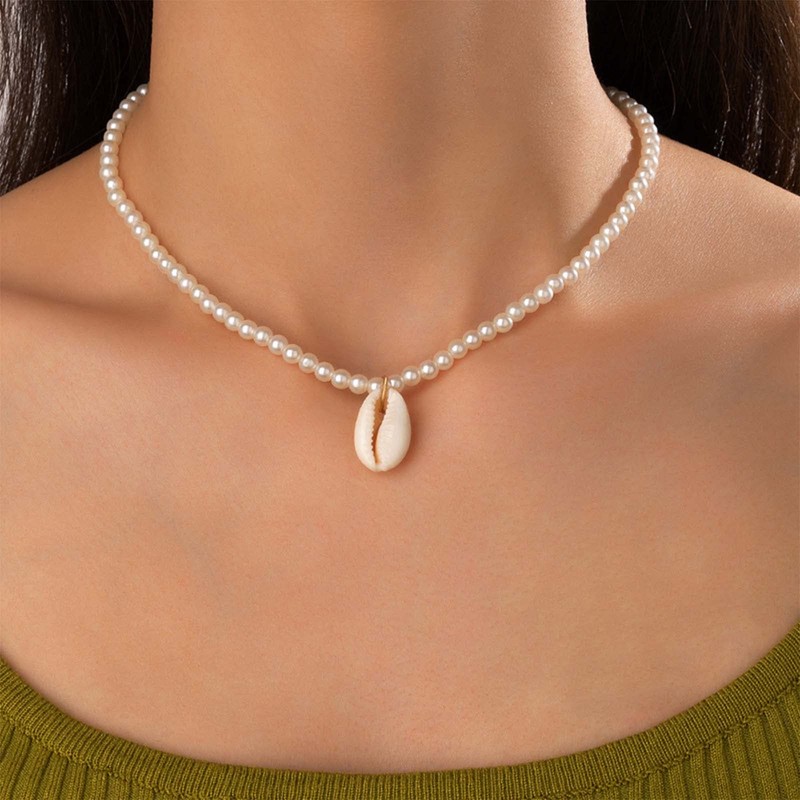 Sttiafay Pearl Choker Necklace for Women Beach Shell Necklace Clavicle Chain Bohemia Shell Pendant Necklace Faux Pearl Chain Ocean Jewelry Gifts for Her