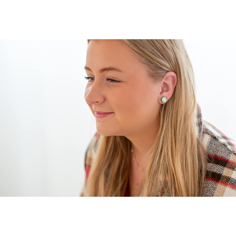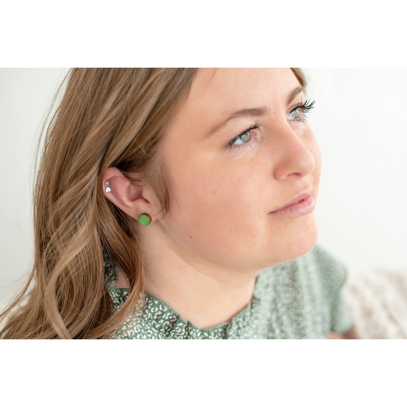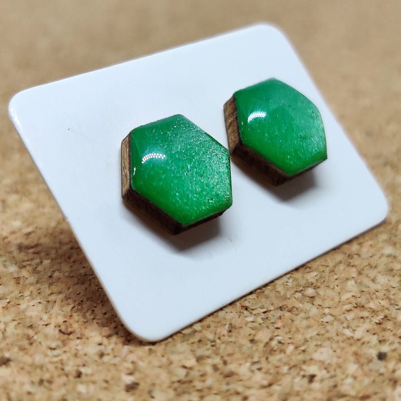 - Stud Earrings, Jade Green Shimmer Hexagon 10 mm, Handmade, Posts for Sensitive Ears. Each pair of earrings are light, unique and fashionable. The earrings are lightweight and feature a colorful jade green shimmery color that is sure to make a statement. Every pair is handcrafted, and hand painted and made at Candi Cove’s studio in Idaho. Explore our selection of stud earrings, where you'll find options to suit everyone's style, for women's boho and fun pieces as well as unique men's designs.