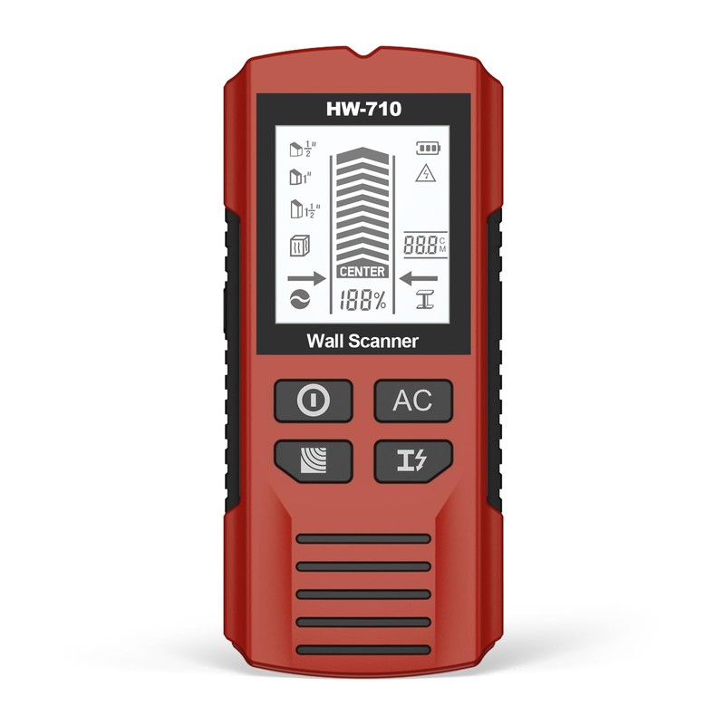 - 【5 in 1 Scanning Modes】The 5-in-1 function combines a stud finder, metal detector, voltage tester and depth gauge, costing less than 1/3 of a traditional toolset.①Stud Scan(0.5"/1"/1.5" depth): Locate wooden beam centers for a secure TV or bookshelf in small or old-house walls.②Metal Scan(2.36" depth): Find hidden pipes and rebars before kitchen or bathroom remodeling, saving big on repairs.③Wire Scan(2" depth): Detect 80-240V live wires with a signal bar and beeps, avoiding shocks.