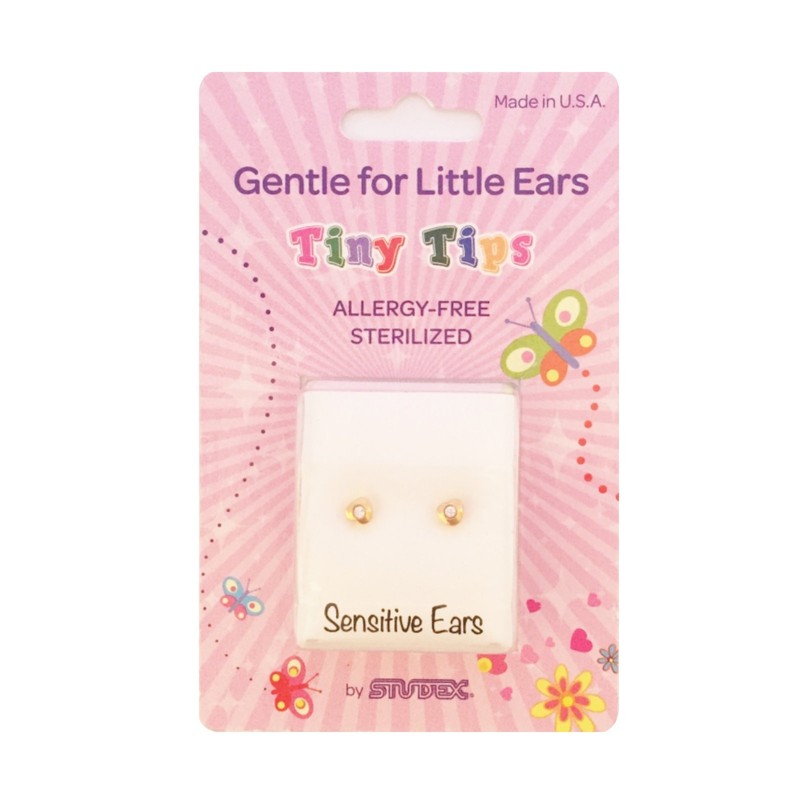Please note the earrings in the picture are magnified to show colours. The motif measures 4mm. 100% Hypo-allergenic. Pair of gold plated Studex earrings which are ideal for everyday use especially if you have sensitive ears. Earrings feature a 4mm heart shape motif with a small clear crystal centre. Earrings are carded and presented in their original sterilized packaging. Earrings have a grooved friction post for secure fastening and butterfly backings to hold securely in place. Medical Grade Surgical Steel or 24K Gold Plated. The Tiny Tips range is an after-piercing fashion product, not to be used to pierce ears. The finest allergy-free earrings in the world. Studex has signified trust and excellence for over four decades as the global leader in specially designed children's earrings for sensitive ears!