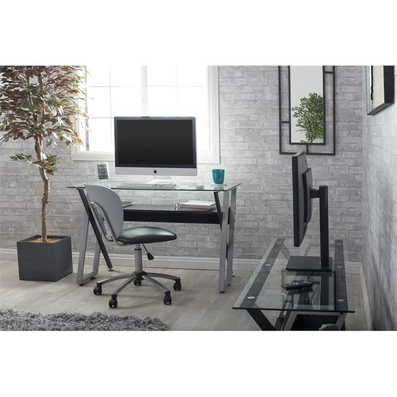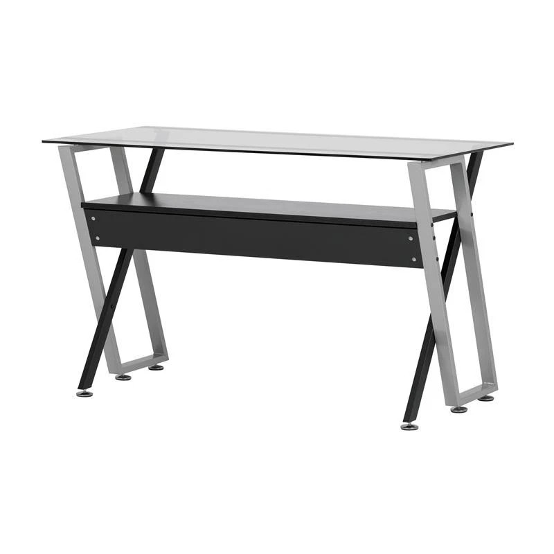 The Colorado Desk features a clear, tempered, safety glass (with black stripes), and a crisscross leg pattern in silver and black. Made out of heavy gauge Stainless Steel, and includes six floor levelers keep this desk nice and even. The center shelf can hold necessary paperwork, or light office supplies.