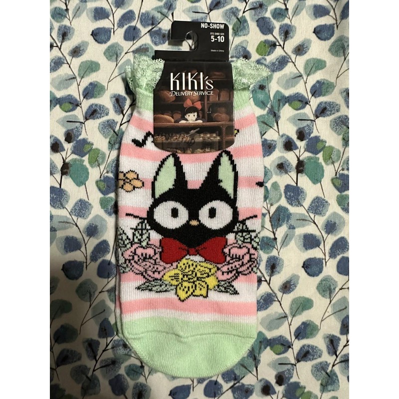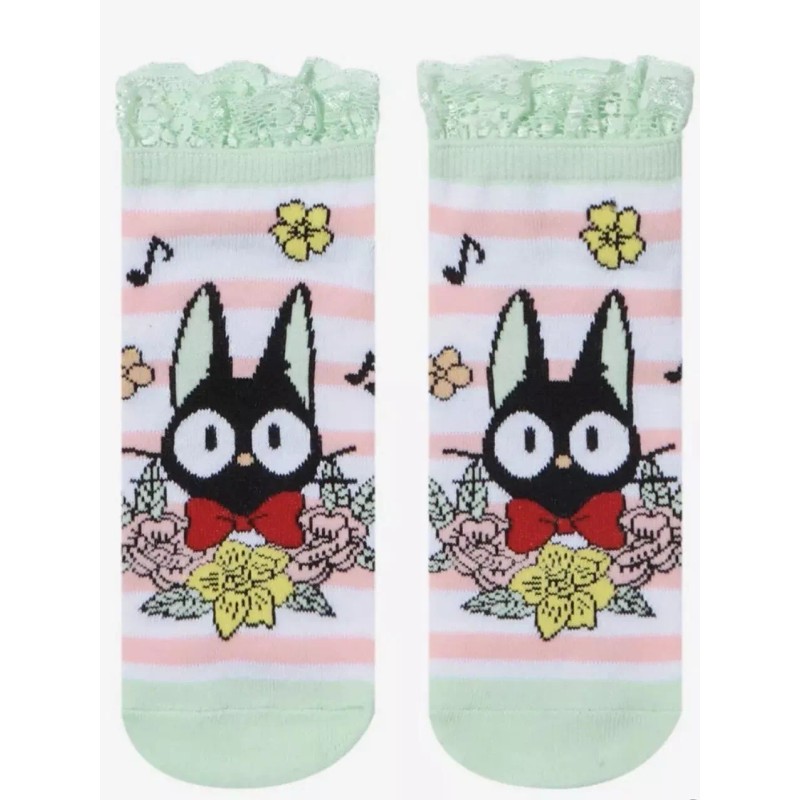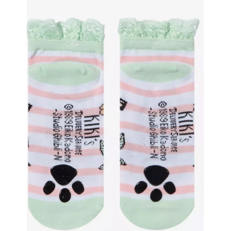 Keep cozy after making deliveries with these Kiki's Delivery Service no-show socks! Featuring Jiji with flowers and a pink and white stripe design. Comes with mint lace trimming up top.