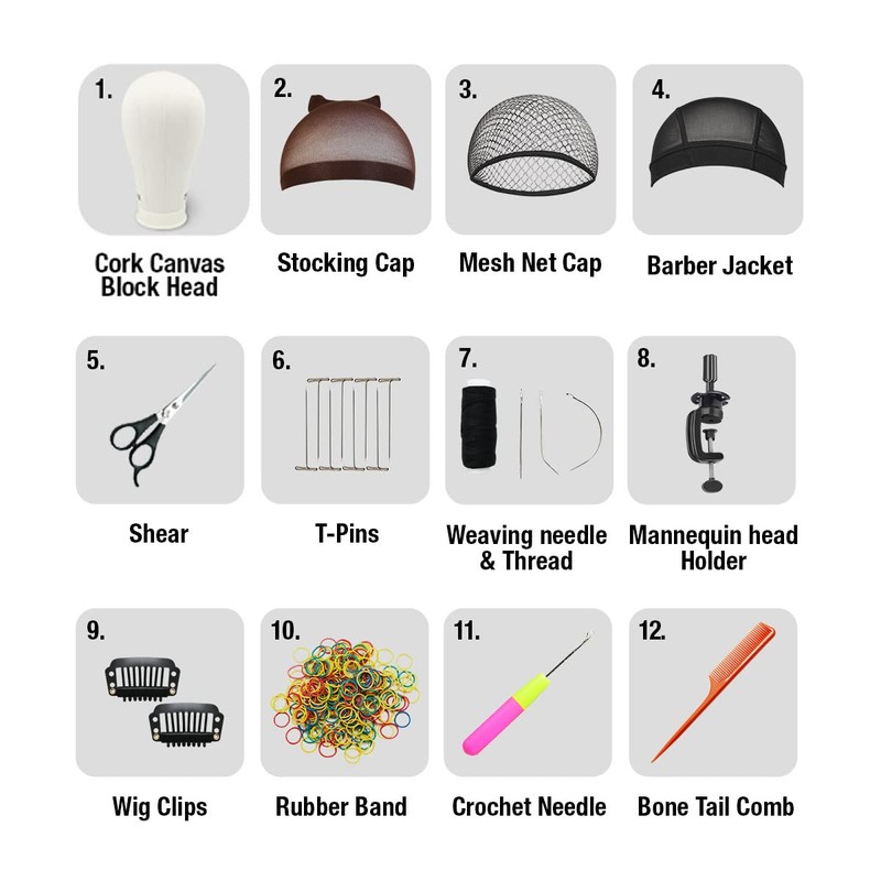 STUDIO LIMITED Polyurethane Canvas Block Head DIY Wig Making Starter Kit 12pcs, PU Mannequin Head Wig Display and Stand for Wig Styling (21" Set)