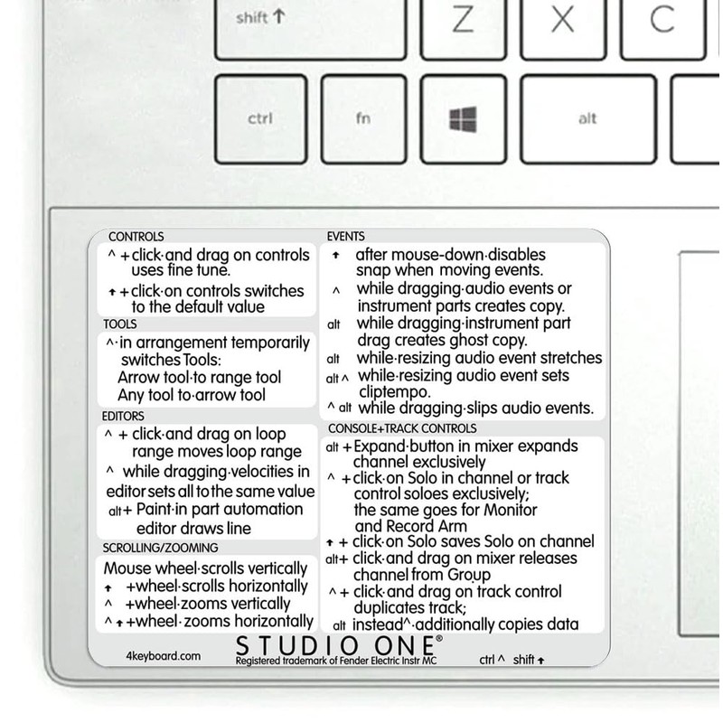 Windows, MS Office, are trademarks of Microsoft Corp. in U.S. and other countries; Studio One are trademarks of PreSonus, Inc. in US and other countries. 4Keyboard is not claiming any of the trademarks used in texts or images. Original sticker design 4Keyboard. All rights reserved, any commercial reproduction is prohibited and is punishable by all applicable laws.