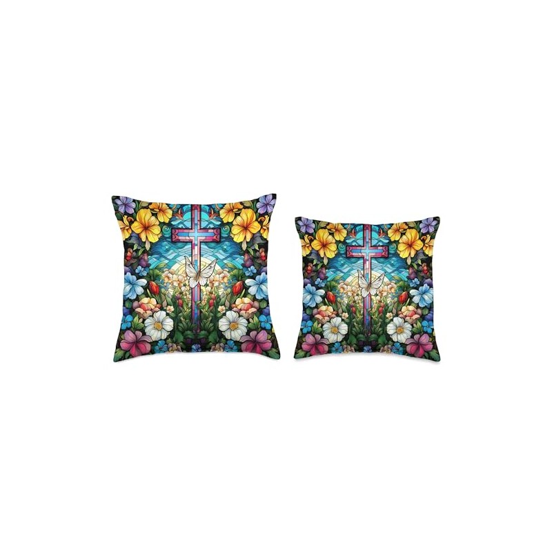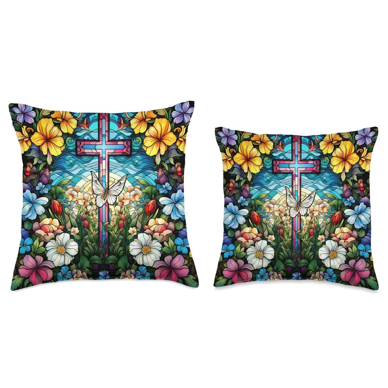 StudioMetzger Beautiful Stained Glass Christian Cross Religious Symbol Throw Pillow, 16x16, Multicolor