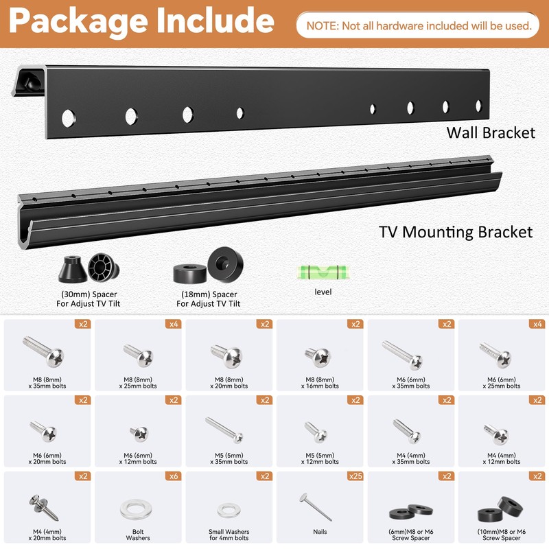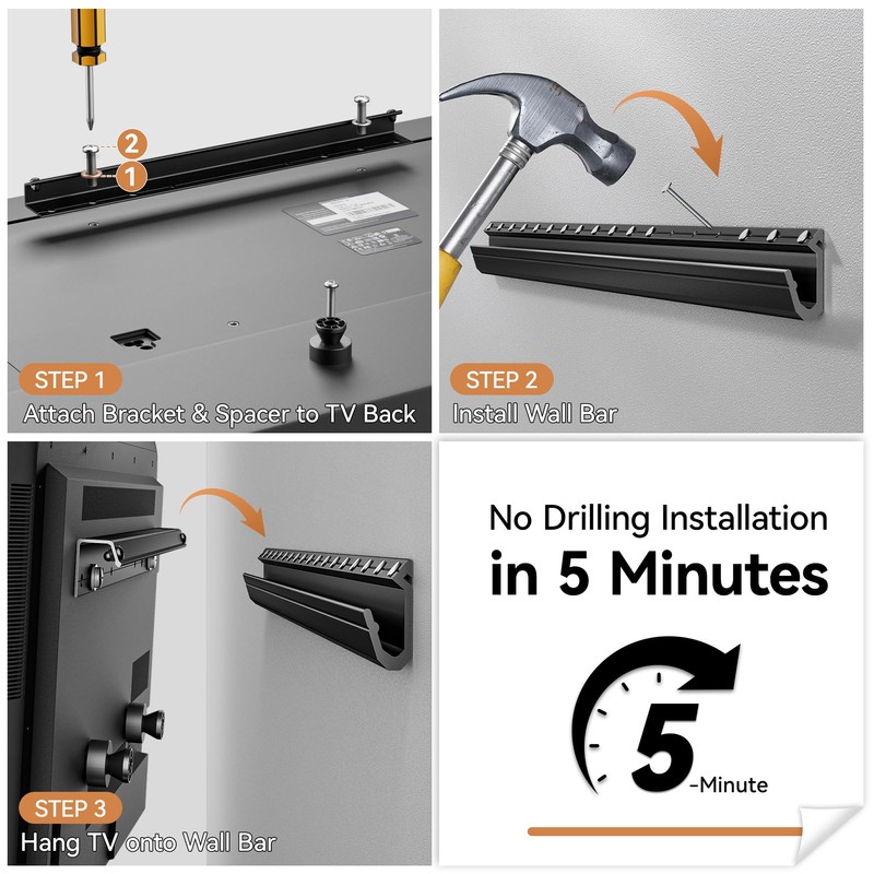 - 【5-Minute Easy Installation – No Tools Required】 Everything you need is in the box of no drill tv mount: built-in bubble level, pre-sorted hardware, and step-by-step manual. Whether you're a pro or a first-time installer, you’ll have your TV mounted with no drill tv wall mount before your coffee gets cold