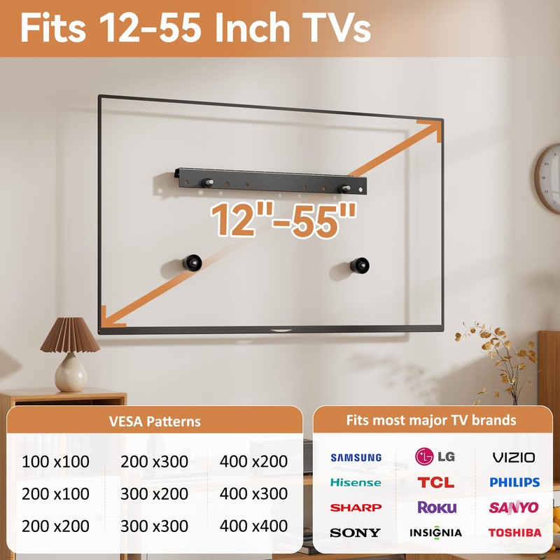 - 【Universal Compatibility – Fits 12”-55” TVs & Holds 100 lbs】 Drywall tv mount supports VESA 100x100mm to 400x400mm patterns, making it compatible with most major tv brands. This no-drill tv mounting bracket is designed for both small and large TVs, ensuring a secure load to support 100 lbs