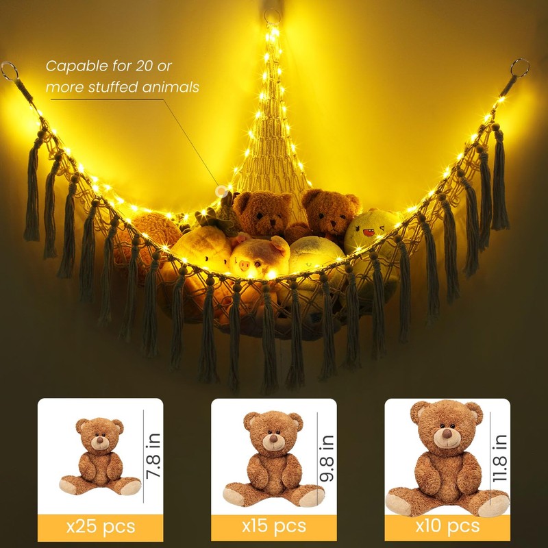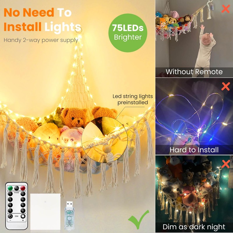 - Exclusive Pre-install Design: 11.8Ft/ 75LEDs USB string lights preinstalled along 3 sides of the hammock, NO NEED TO assemble string lights yourself. The stuffed animal net is made of premium cotton rope. Eco-friendly, handmade macrame decor applied to the stuffed animal hammock. The hanging net with iron ring would never loose or transform, absolutely strong, steady and durable.