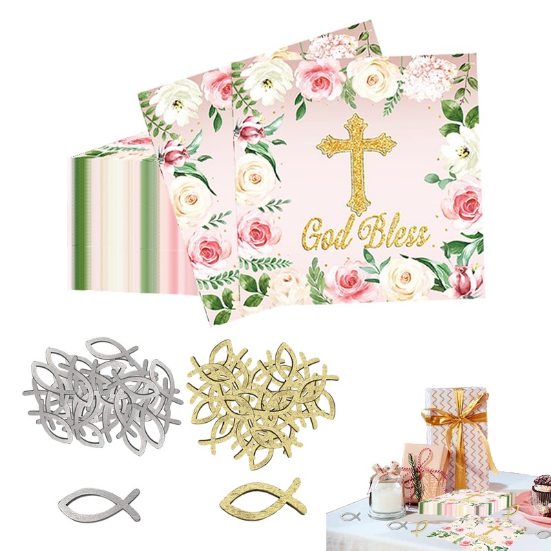 - What You'll Get: Our package includes four packs of Communion napkins, with 20 napkins in each pack, totaling 80 napkins. The napkins measure 17cm each. Additionally, we've included 80 wooden hollow-out fish, 40 gold fish (3.5cm each), and 40 silver fish (3.5cm each).