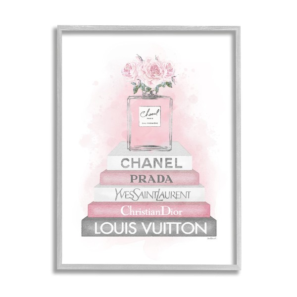 Stupell Industries Pink Roses Perfume Bottle Glam Fashion Bookstack, Designed by Amanda Greenwood Gray Framed Wall Art, 24 x 30