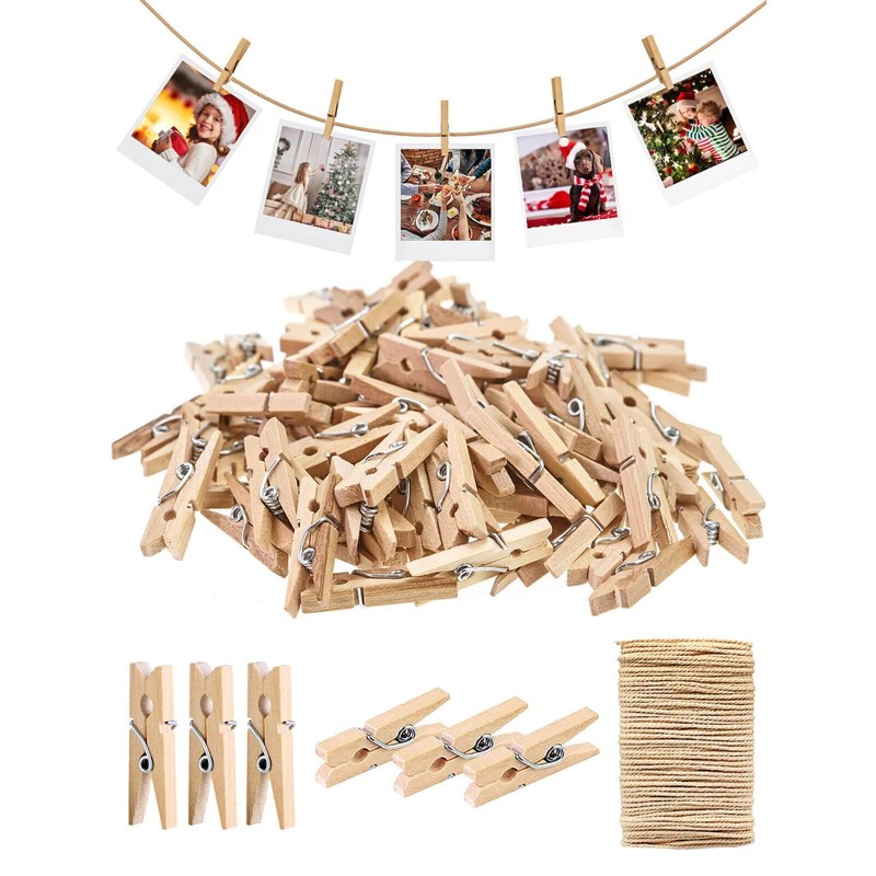 - đČăNatural Wooden Mini Clothespinsă- Package includes 150 PCS clothes pin for pictures and 32 Feet jute twine (10 meters). Our small clothes pins for photos are natural mini wooden clothespins for photos. Photo clips size: (L) 25mm x (W) 3mm x (D) 8mm.